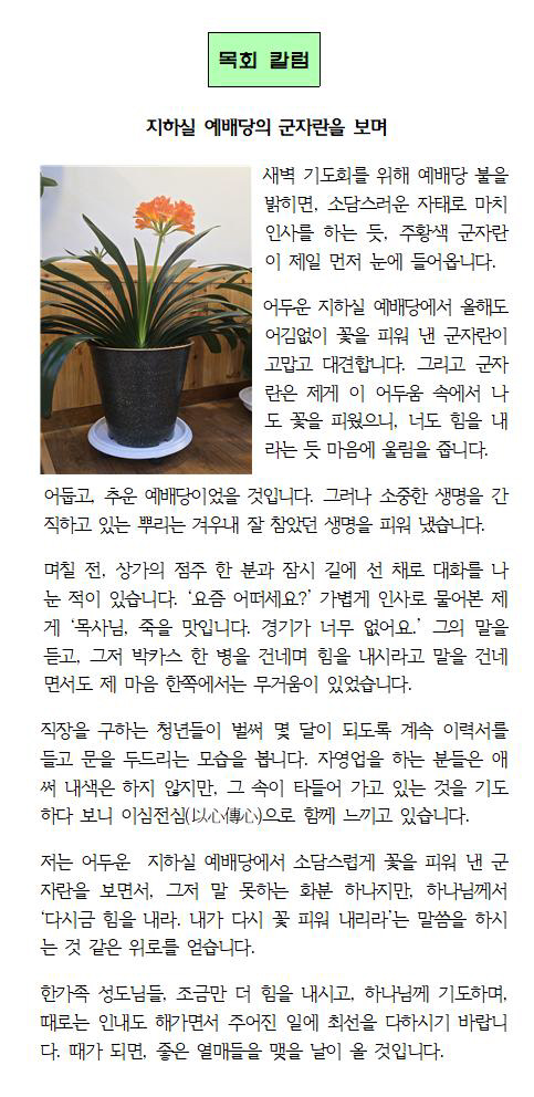 지하실 예배당의 군자란을 보며 운영자 2026-03-21 추천 0 댓글 0 조회 13 http://www.hangajok.net/bbs/bbsView/69/6618063 첨부파일 (0) 0